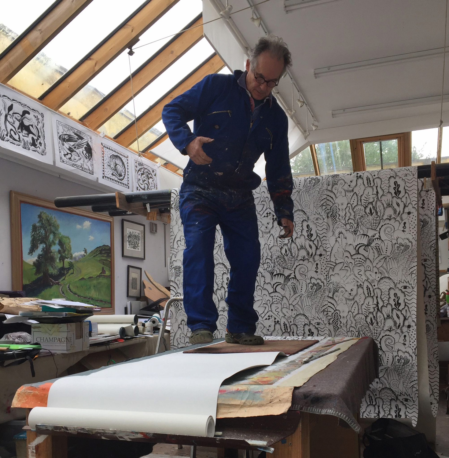 Hugh Dunford Wood worked as an independent artist designer since student days at Oxford’s Ruskin School of Art in the 1970s. He made a good living painting landscapes and portraits and ran a fashion business for 15 years hand-painting mens’ ties with a team of 24 artists under his direction. He designs crockery, jewellery, furnishing fabrics and wallpapers.