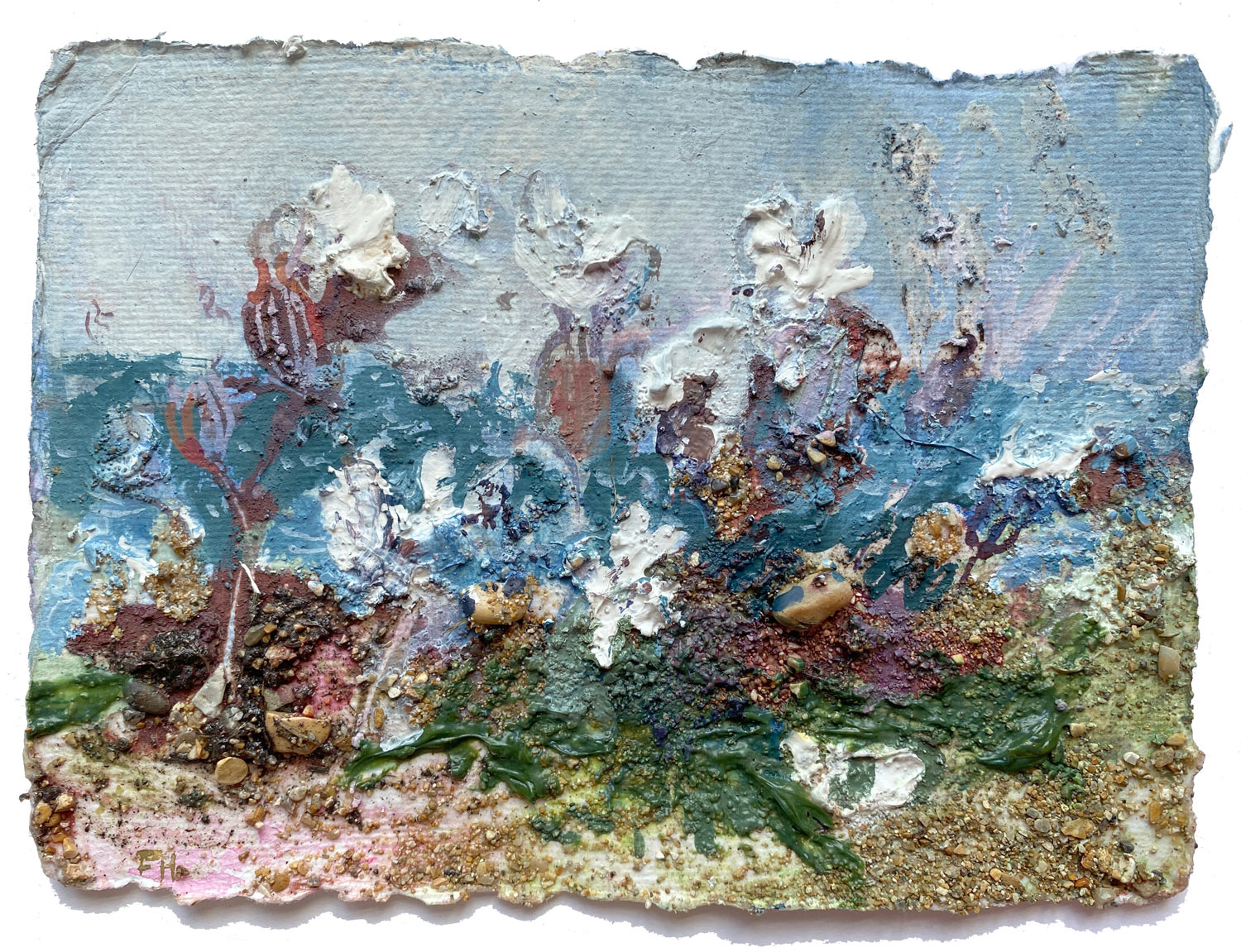 Chesil Beach site materials and watercolour with acrylic binding medium on handmade cotton rag paper, mounted.