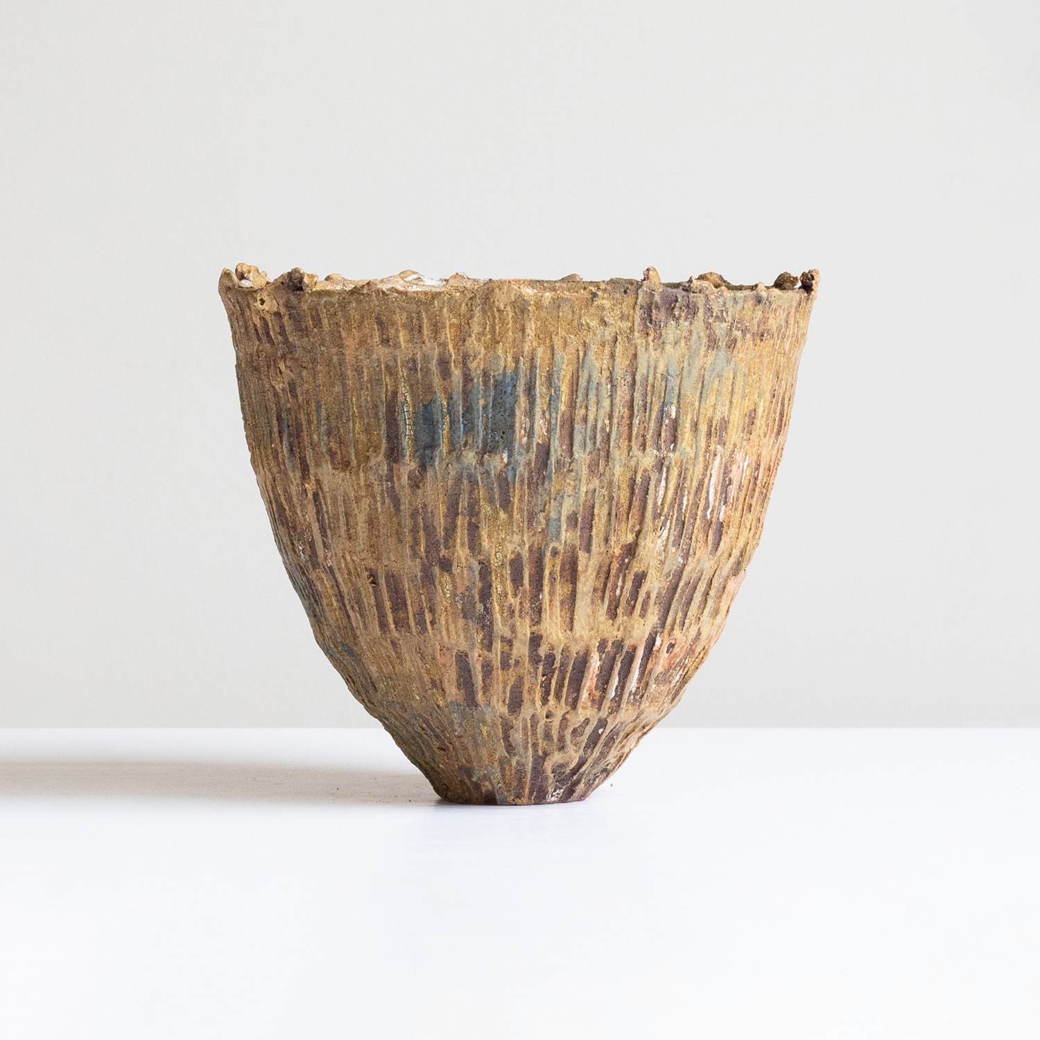Wheel thrown and hand carved, red stoneware clay with layered slips & glazes.